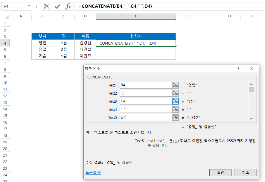이 함수는 더 간편하다. 함수 상자가 열리면 합칠 텍스트를 순서대로 지정만 해주면 된다.