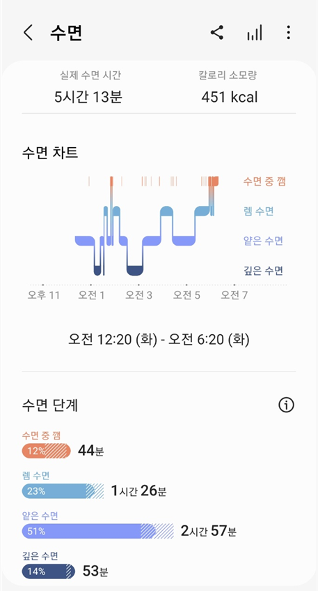 갤럭시 워치를 차고 자면, 다음 날 아침 위와 같은 데이터를 확인할 수 있다. 수면 주기와 각 수면 단계에서 얼마나 머물렀는지를 생각보다 자세하게 파악할 수 있다.